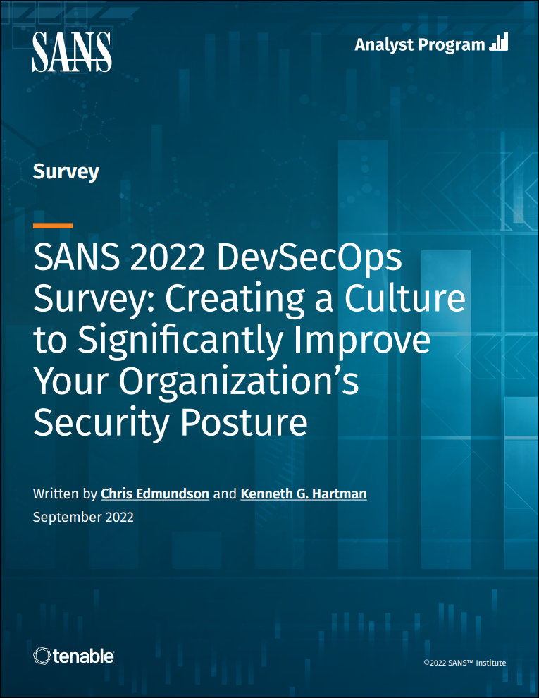 Tenable is proud to sponsor the SANS 2022 DevSecOpsSurvey: Creating a Culture to Significantly ImproveYour Organization’s Security Posture. The SANS 2022 DevSecOps survey is a yearly retrospective that quantifies progress made toward improving organization's security posture and operational effectiveness. The report details best practices in the alignment of development, security and operations teams and securing multiple cloud environments at scale. Other key report topics include: