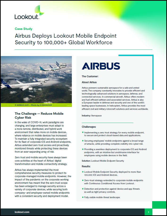 Securing a global organization that is constantly at the forefront of aerospace innovation is no small task. In order to keep over 100,000 iOS and Android devices safe from the most evasive mobile threats, Airbus turned to Lookout to help them stay ahead of the ever-changing threat landscape.