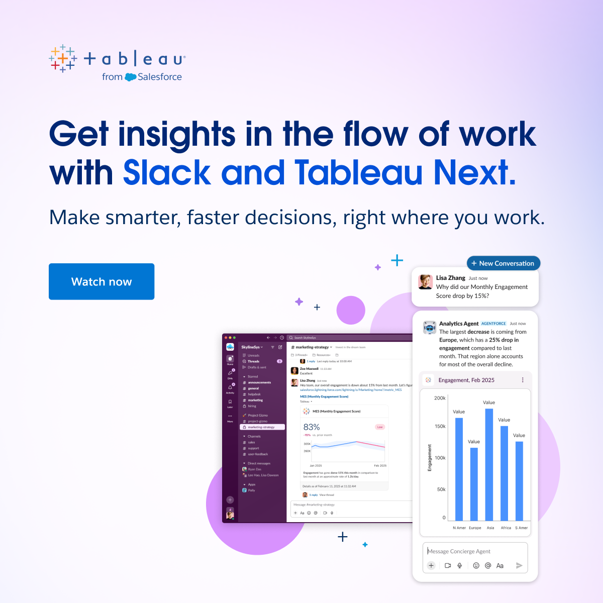 Join us for a deep dive into how Tableau Next empowers business users to stay close to key metrics and drive action, all within their existing workflow. This session explores how Tableau Next delivers trusted, governed insights in the flow of work. Whether it’s tracking performance, exploring trends, or collaborating across teams, we’ll show how insights come to life within the Salesforce Lightning experience and Slack. Discover how users can follow metrics, explore data, and take action right where they work. We’ll show you how Tableau Next accelerates the path from insight to impact and helps teams make smarter, faster decisions.